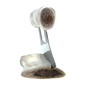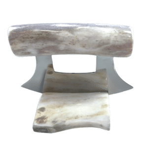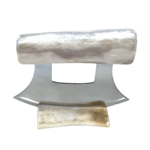 This sun bleached caribou antler Ulu is created here in Alaska. The handle and base are both made out of sun bleached caribou antler. Additionally, the blade is made out of stainless steel and is about 5.5″ wide. Due to the grain of the wood, each knife and base set have a distinctive one of a kind look. This piece makes a great traditional knife for a collector. As well as a useful tool in the kitchen for vegetables and pizza.