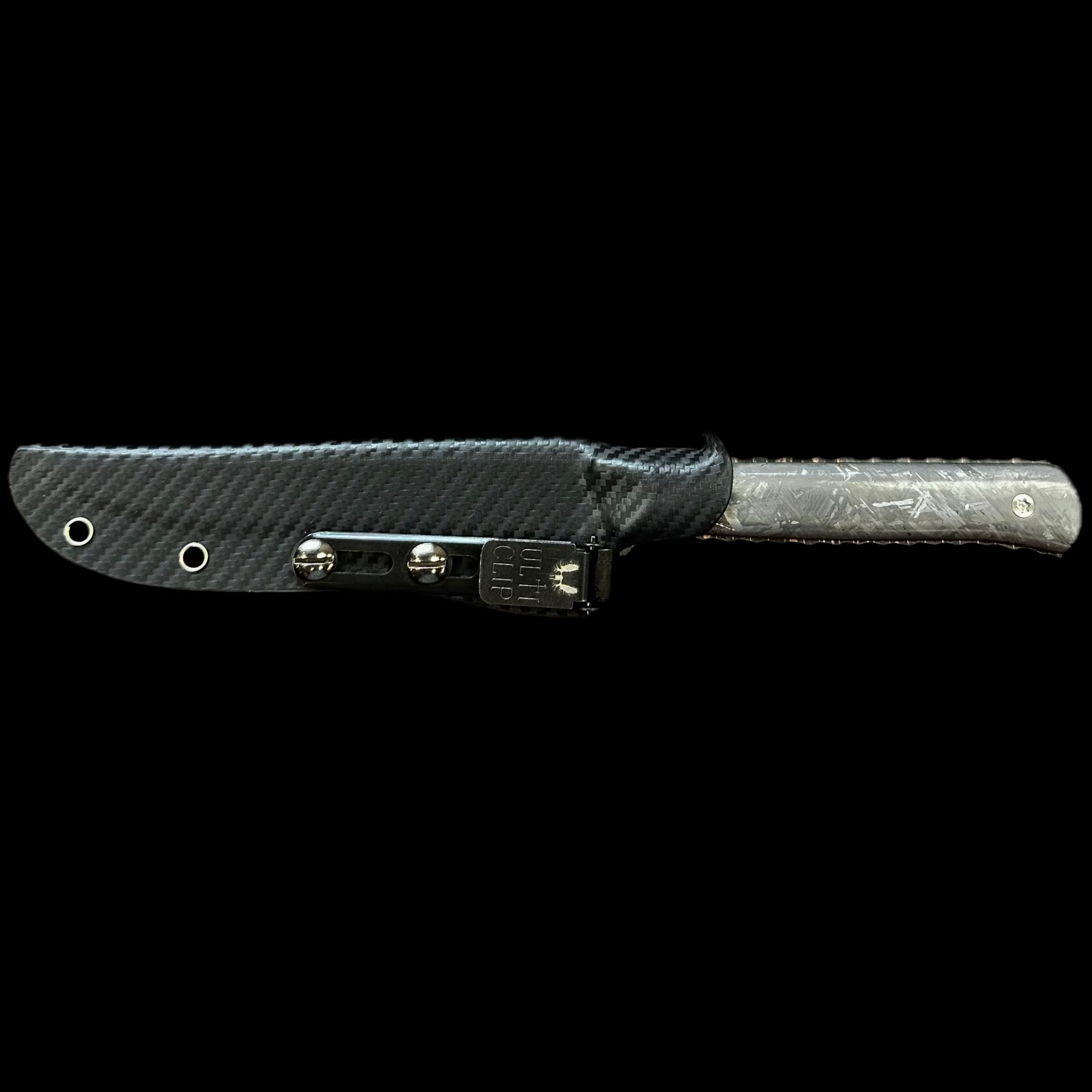 This is an 11″ long fillet knife. Its blade is a Baker Forge’s copper damascus. The handle is made of solid meteorite and has matching liners. This knife comes with a heat-fitted sheath that has an attaching clip for easy carry. These are 100% Alaska made knives.