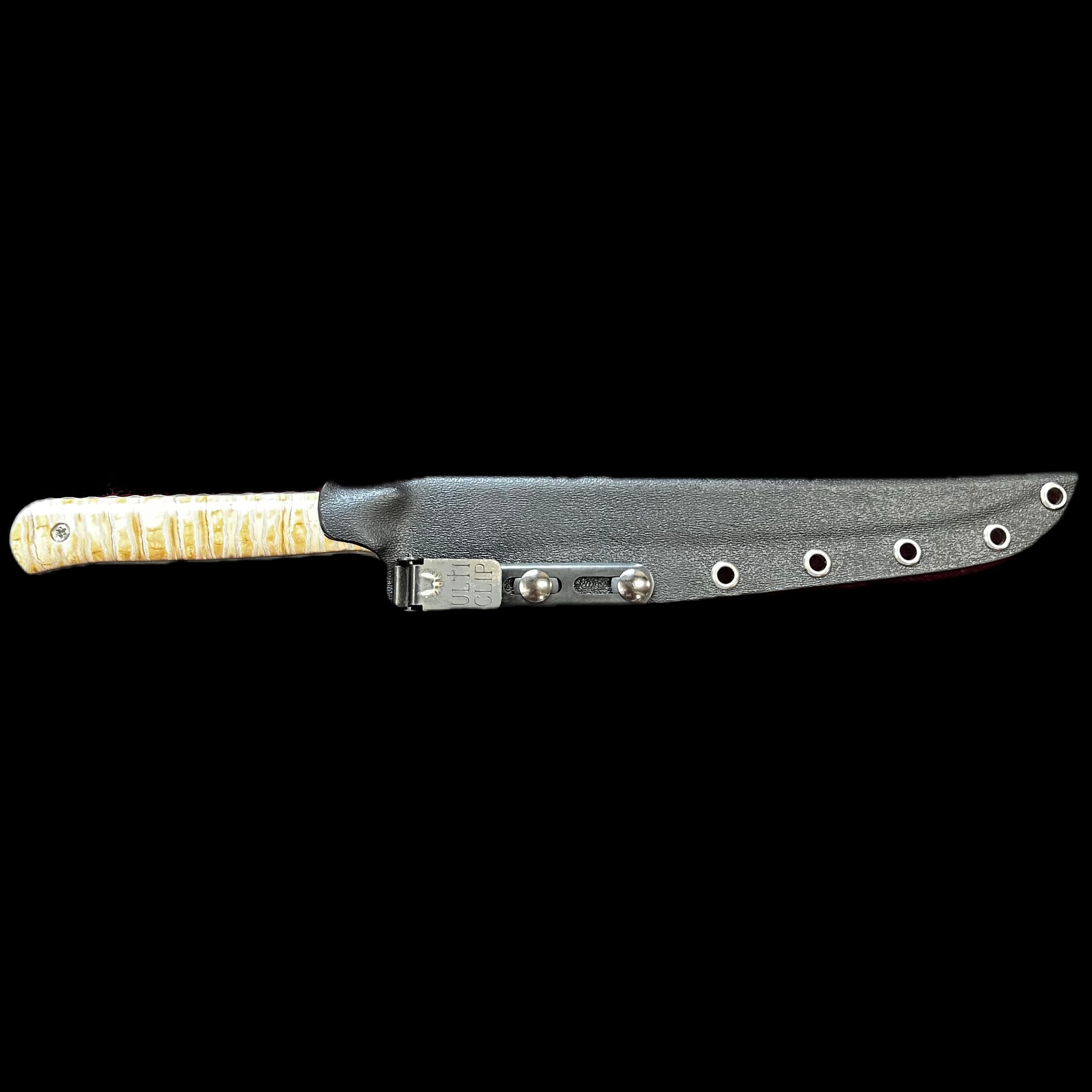 This is a 13″ long fillet knife. Its blade is a magnacut stainless steel with double acid etch. The handle is made of natural mammoth molar and has matching liners. This knife comes with a heat-fitted sheath that has an attaching clip for easy carry. These are 100% Alaska made knives.