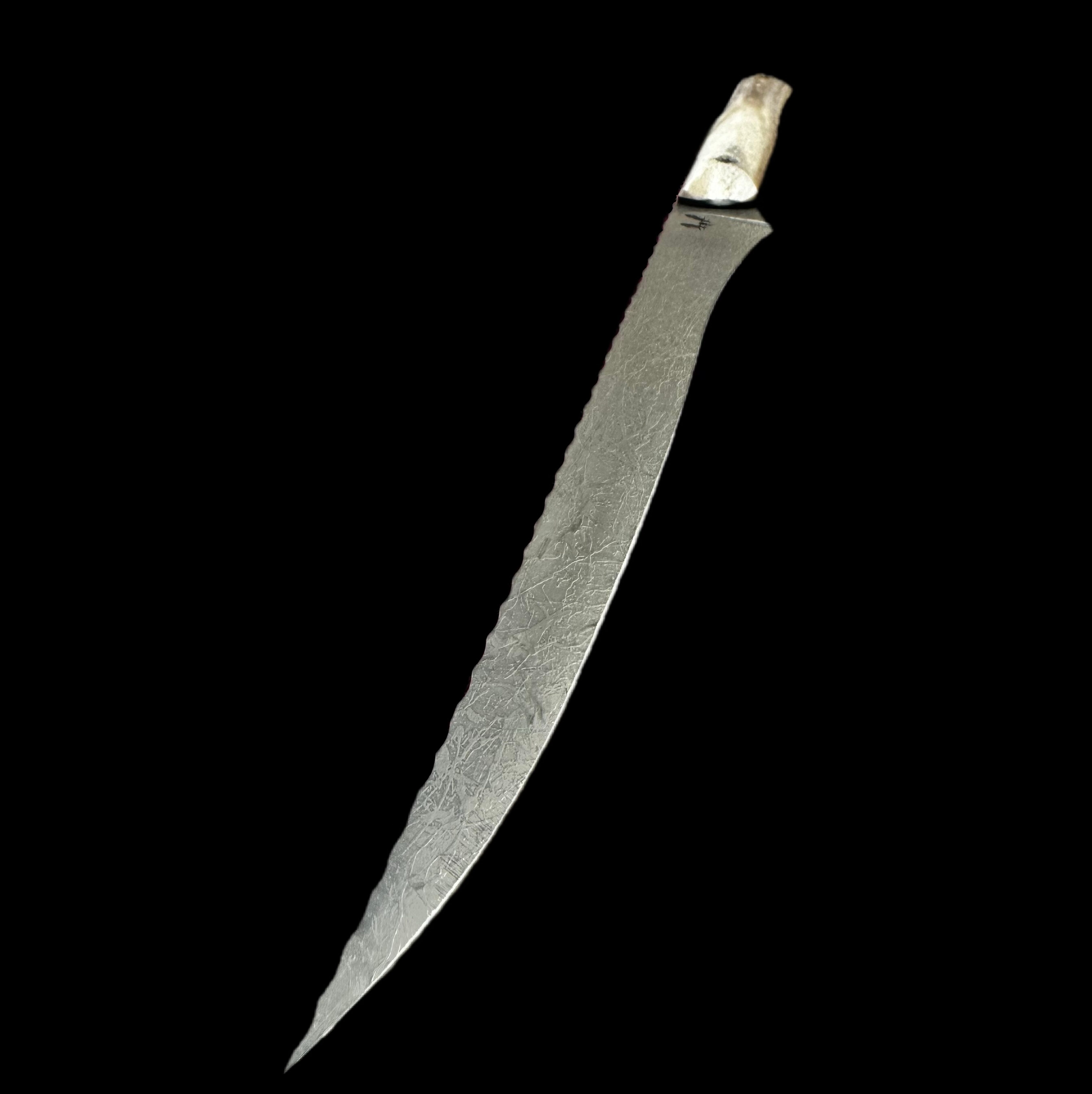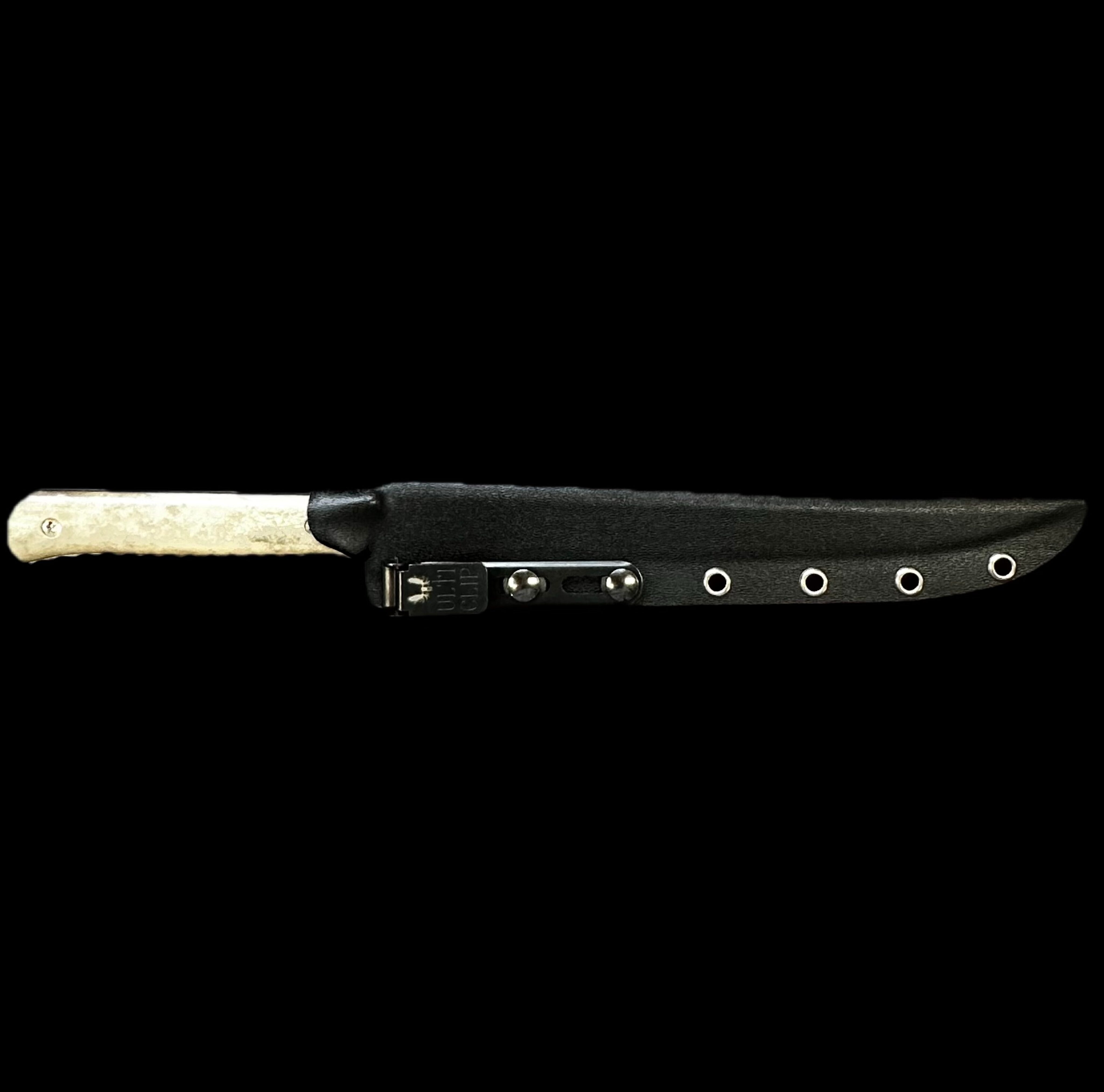 This is a 13″ long fillet knife. Its blade is stainless steel with a double acid etch. The handle is made of natural, polished moose antler and has matching liners. This knife comes with a heat-fitted sheath that has an attaching clip for easy carry. These are 100% Alaska made knives.