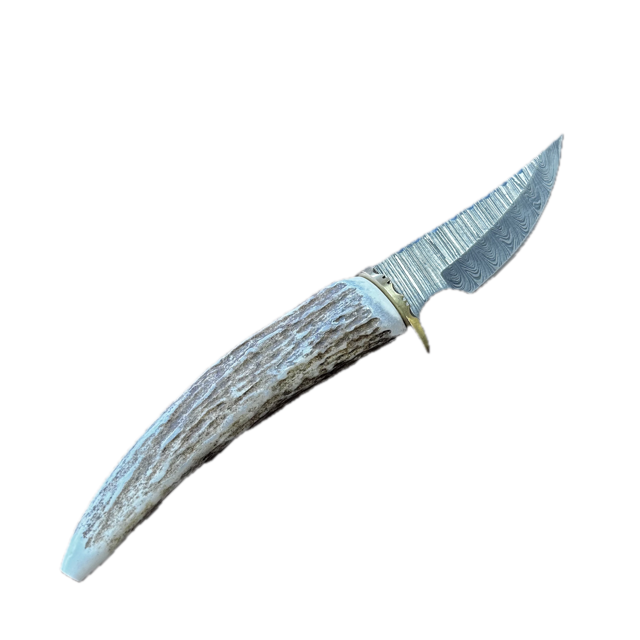 The 10.5″ moose antler handle knife comes with a heavy-duty leather sheath. Alaska Natives beachcomb throughout Alaska, finding various durable materials, and then sell it to the carvers and artists. The blade is made with Damascus steel.