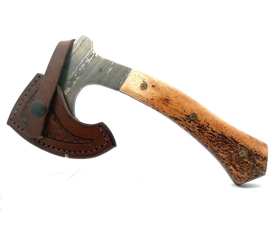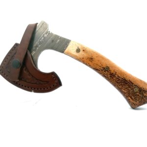 The 7″ oosik handle hatchet comes with a heavy duty leather sheath. Fossilized walrus “oosik,” which is the male walrus penis bone, makes up the handle. Alaska Natives beachcomb throughout Alaska, finding various durable materials, and then sell it to the carvers and artists. The blade is made of Damascus steel.