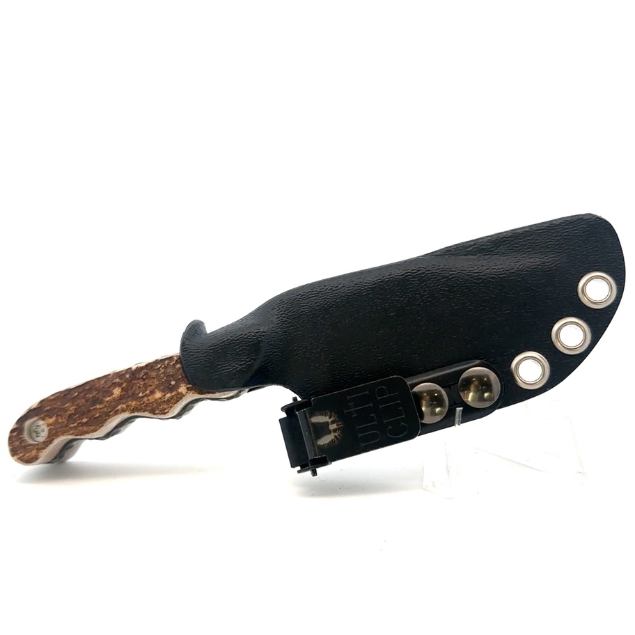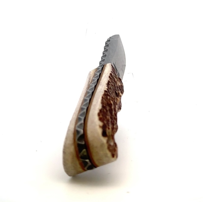 This is a 6″ long knife. Its blade is a magnacut stainless steel that is double acid-etched. The handle is made of natural raw moose antler and has matching liners. This knife comes with a heat-fitted sheath that has an attaching clip for easy carry. These are 100% Alaska made knives.