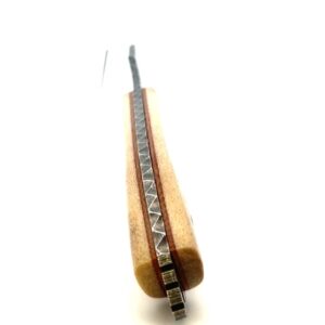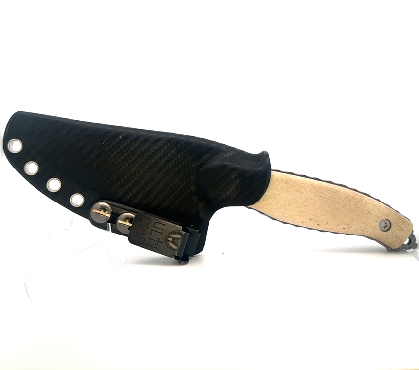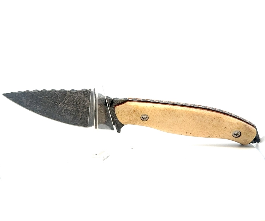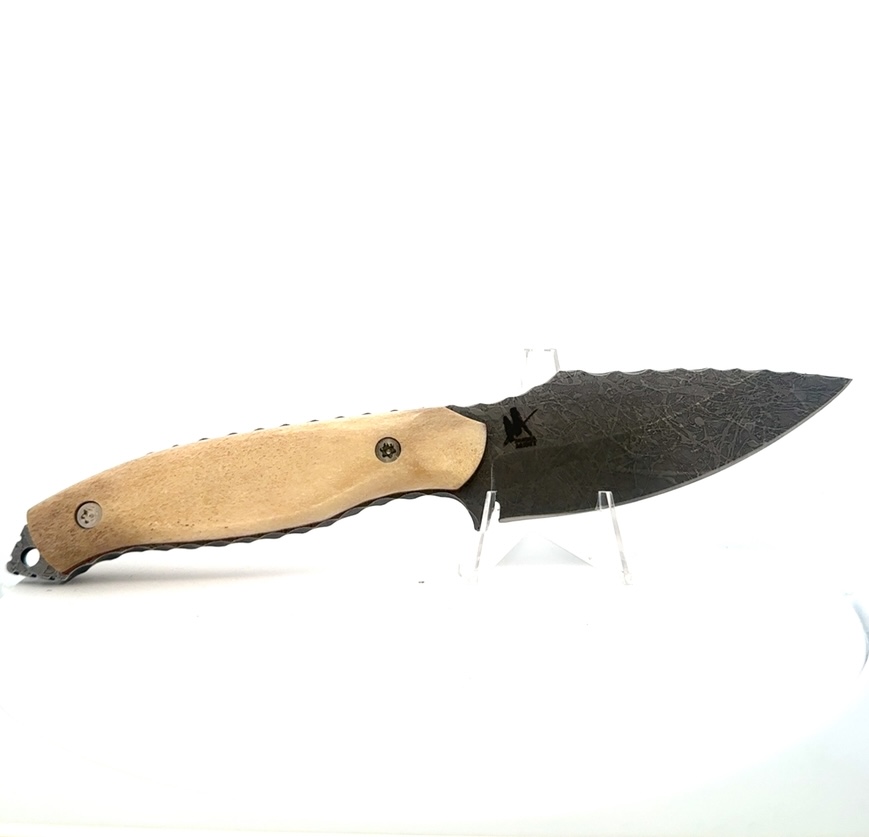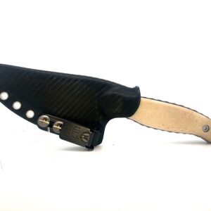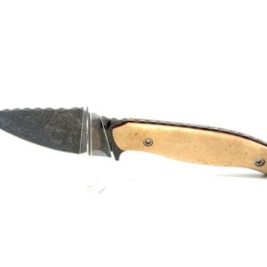 This is an 8.5″ long knife. Its blade is magnacut stainless steel with a double acid-etched finish. The handle is made of natural, polished moose antler and has matching liners. This knife comes with a heat-fitted sheath that has an attaching clip for easy carry. These are 100% Alaska made knives.