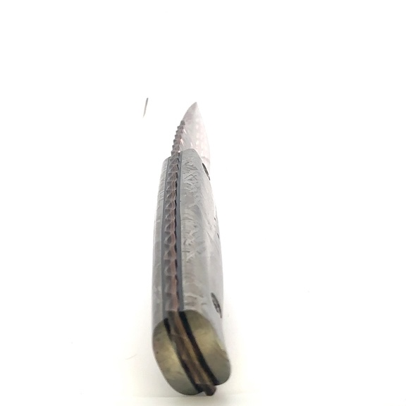 This is an 8.5″ long knife. Its blade is Baker Forge’s copper damascus. The handle is made of solid meteorite and has matching liners. This knife comes with a heat-fitted sheath that has an attaching clip for easy carry. These are 100% Alaska made knives.