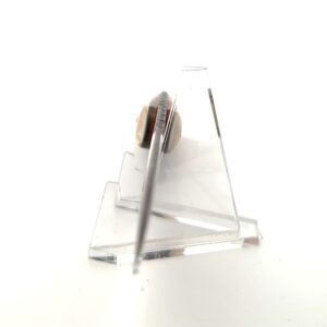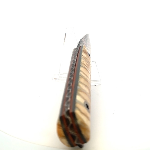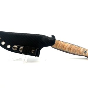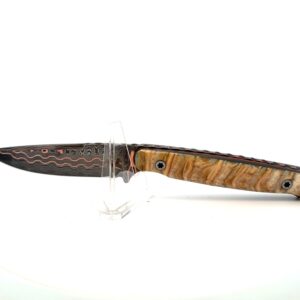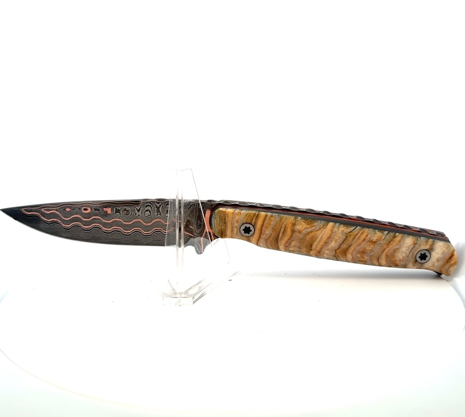 This is an 8.5″ long knife. Its blade is Baker Forge’s copper damascus. The handle is made of natural mammoth molar and has matching liners. This knife comes with a heat-fitted sheath that has an attaching clip for easy carry. These are 100% Alaska made knives.