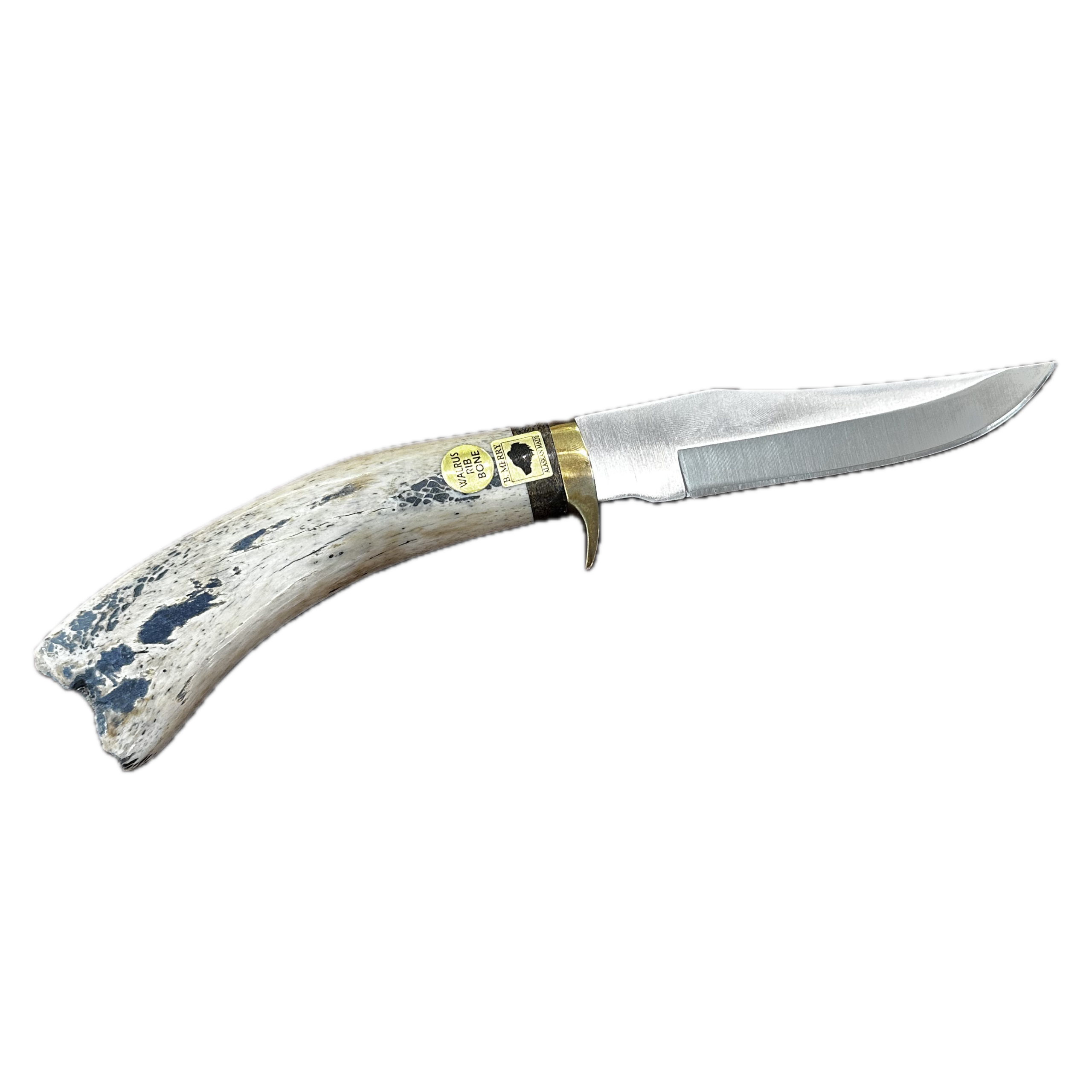 The 10.5″ walrus rib bone handle knife comes with a heavy duty leather sheath. This piece has an oosik spacer right before the blade begins. Alaska Natives beachcomb throughout Alaska, finding various durable materials, and then sell it to the carvers and artists. The blade is made with steel.