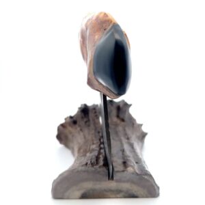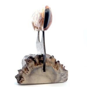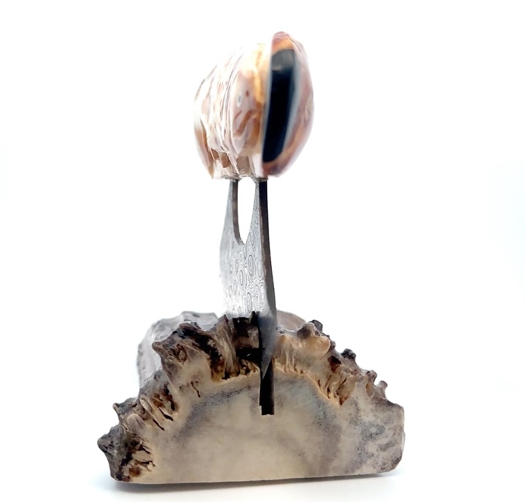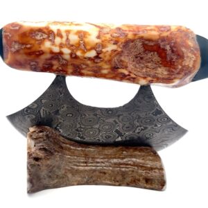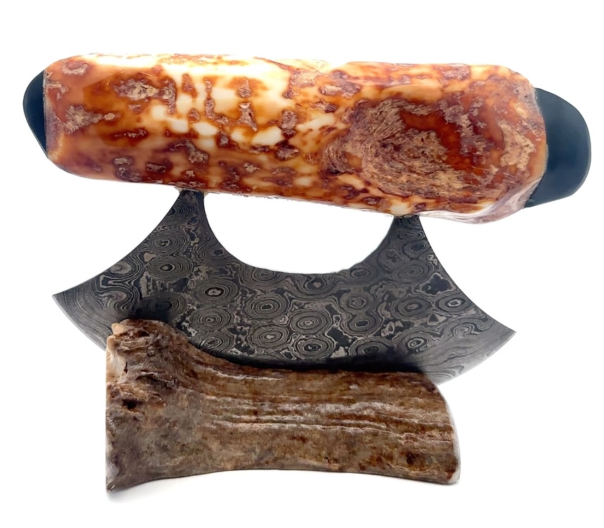 This walrus ivory artifact Ulu is created here in Alaska. The base is made out of moose antler. Additionally, the blade is made out of layered Damascus steel. This piece is carved and signed by an Alaska native artist . Due to the material being natural, each knife and base set has a distinctive one-of-a-kind look. This piece makes a great traditional knife for a collector. As well as a useful tool in the kitchen for vegetables and pizza.