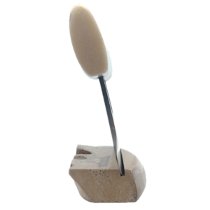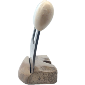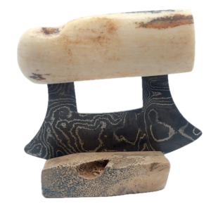 This fossilized walrus artifact Ulu, was created here in Alaska. The base is made out of walrus ivory. Additionally, the blade is made out of layered Damascus steel. This piece was created by knife maker Bob Merry. Due to the material being natural, each knife and base set has a distinctive one-of-a-kind look. There are 5 of these pieces, and each looks different. This piece makes a great traditional knife for a collector. As well as a useful tool in the kitchen for vegetables and pizza.