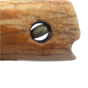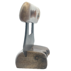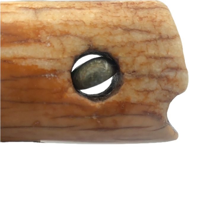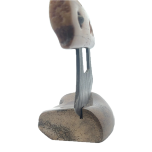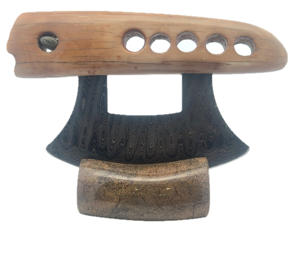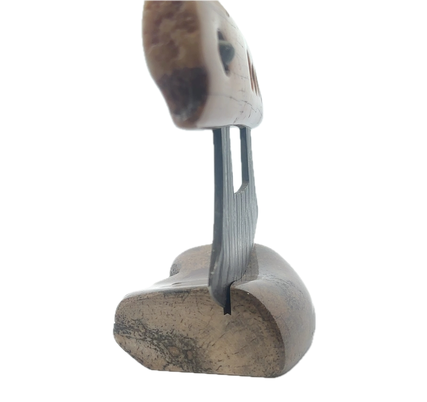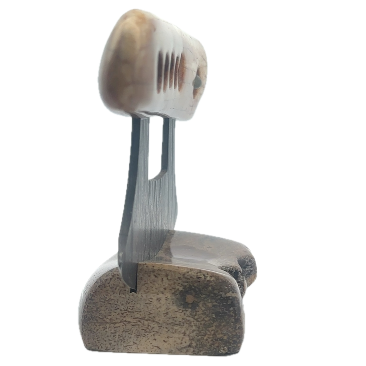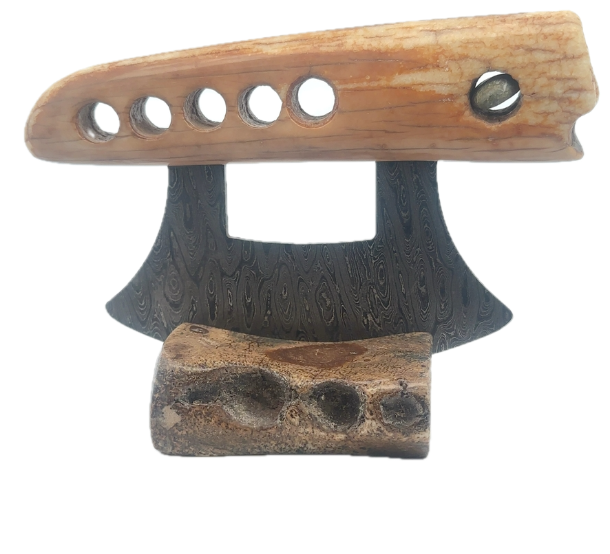This fossilized walrus ivory fire starter artifact Ulu, was created here in Alaska. The base is made out of walrus ivory. Additionally, the blade is made out of layered Damascus steel. This piece was created by knife maker Bob Merry. Due to the material being natural, each knife and base set has a distinctive one-of-a-kind look, especially with this piece, which features a perfectly lodged stone in the handle. This piece makes a great traditional knife for a collector. As well as a useful tool in the kitchen for vegetables and pizza.