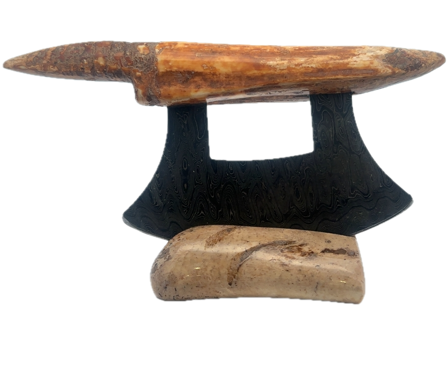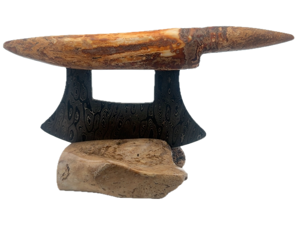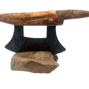 This walrus ivory artifact Ulu, was created here in Alaska. The base is made out of walrus ivory. Additionally, the blade is made out of layered Damascus steel. This piece was created by knife maker Bob Merry. Due to the material being natural, each knife and base set has a distinctive one-of-a-kind look. This piece makes a great traditional knife for a collector. As well as a useful tool in the kitchen for vegetables and pizza.
