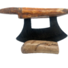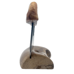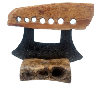 This walrus ivory artifact sled runner Ulu, was created here in Alaska. The base is made out of walrus ivory. Additionally, the blade is made out of layered Damascus steel. This piece was created by knife maker Bob Merry. Due to the material being natural, each knife and base set has a distinctive one-of-a-kind look. This piece makes a great traditional knife for a collector. As well as a useful tool in the kitchen for vegetables and pizza.