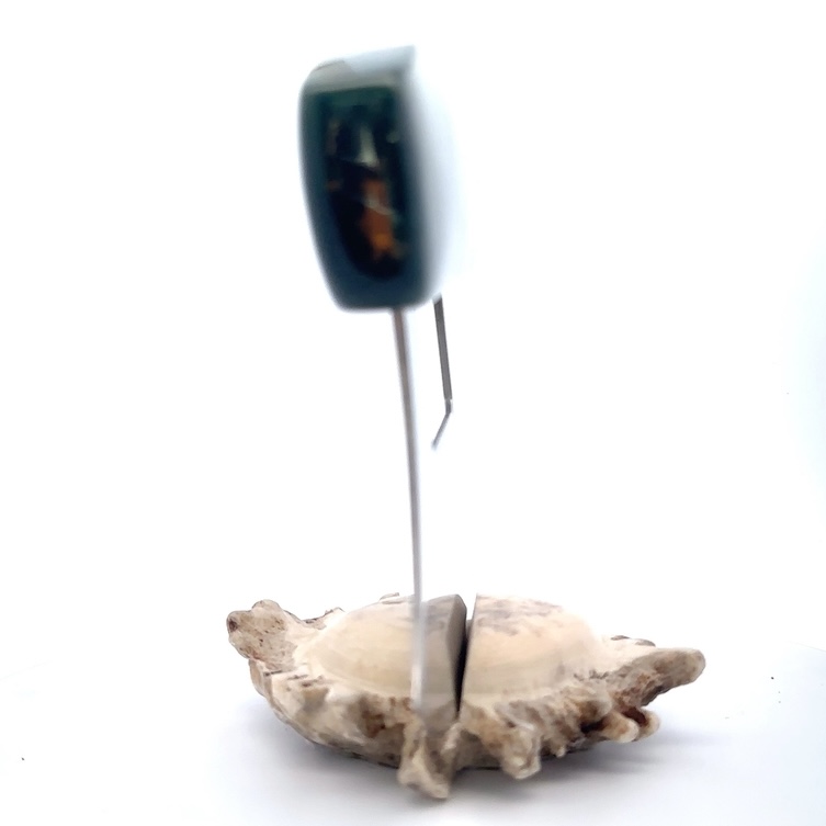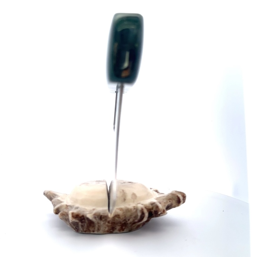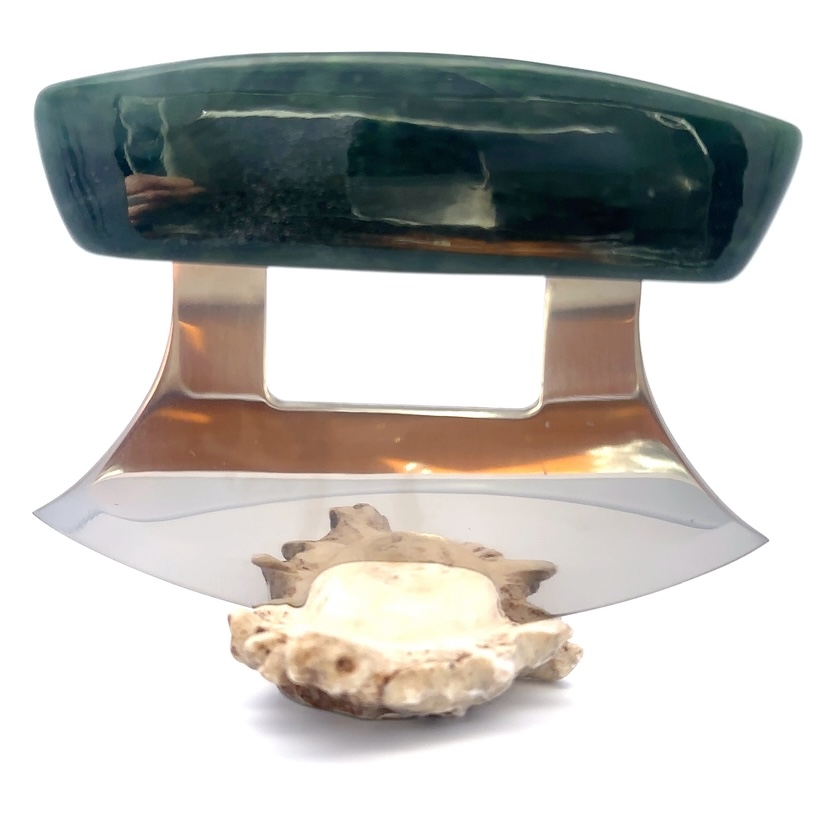 This jade Ulu is created here in Alaska. The base is made of moose antler. Additionally, the blade is made out of stainless steel. Due to the material being natural, each knife and base set have a distinctive one of a kind look. This piece makes a great traditional knife for a collector. As well as a useful tool in the kitchen for vegetables and pizza.