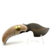 This sun bleached caribou antler Ulu is created here in Alaska. The handle and base are both made out of sun bleached caribou antler. Additionally, the blade is made out of stainless steel and is about 5.5″ wide. Due to the grain of the wood, each knife and base set have a distinctive one of a kind look. This piece makes a great traditional knife for a collector. As well as a useful tool in the kitchen for vegetables and pizza.