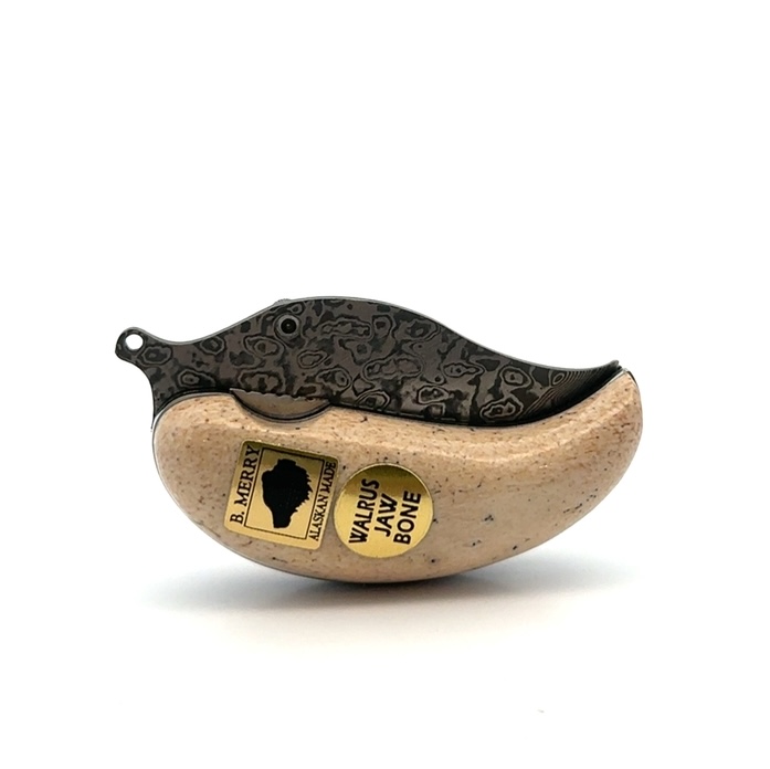 This interesting Ulu shaped pocket knife is about 2 3/4″ long when folded and just over 4 1/2 when open. The handle is made of fossil walrus jaw bone, this is a beautiful and very durable material found along the northwest coast of Alaska. It is designed and made here in Anchorage by Alaskan knife maker, Bob Merry.