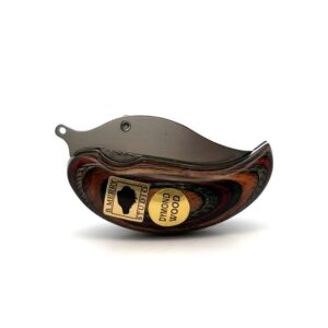 This interesting Ulu shaped pocket knife is about 2 3/4″ long when folded and just over 4 1/2 when open.The handle is made of Dymond wood, layers of dyed wood. There are several subtle color variations. It is designed and made here in Anchorage by Alaskan knife maker, Bob Merry.