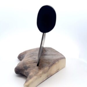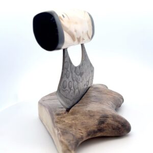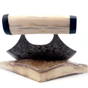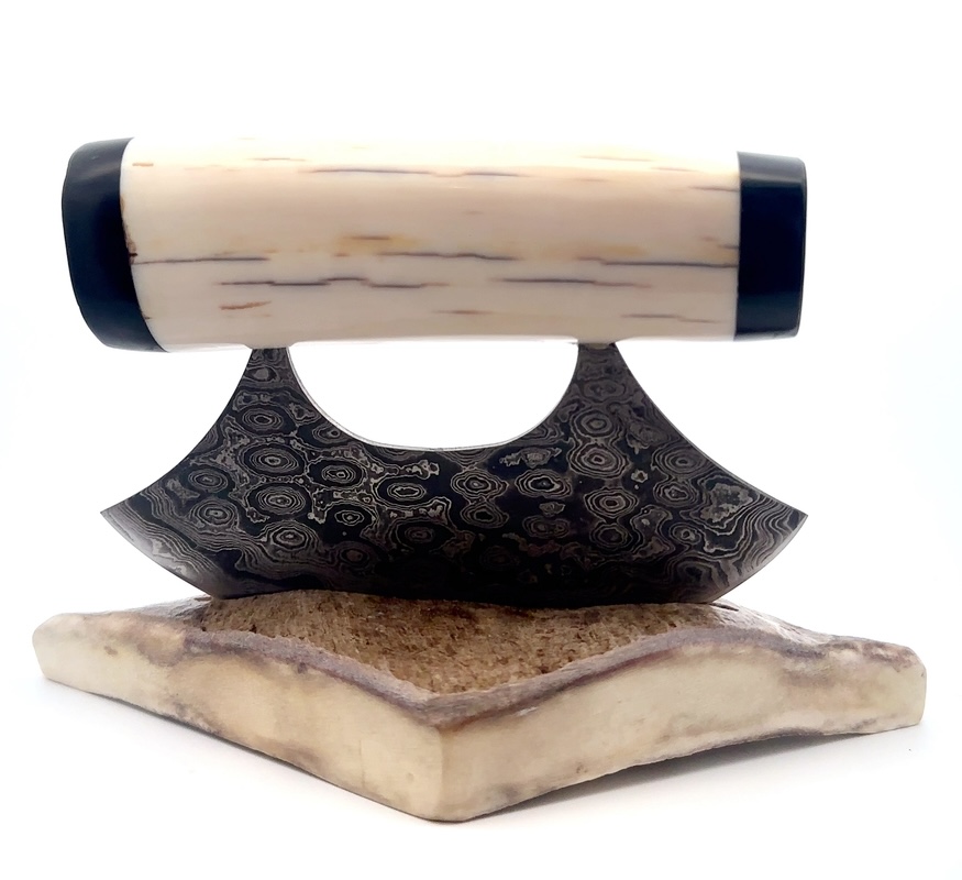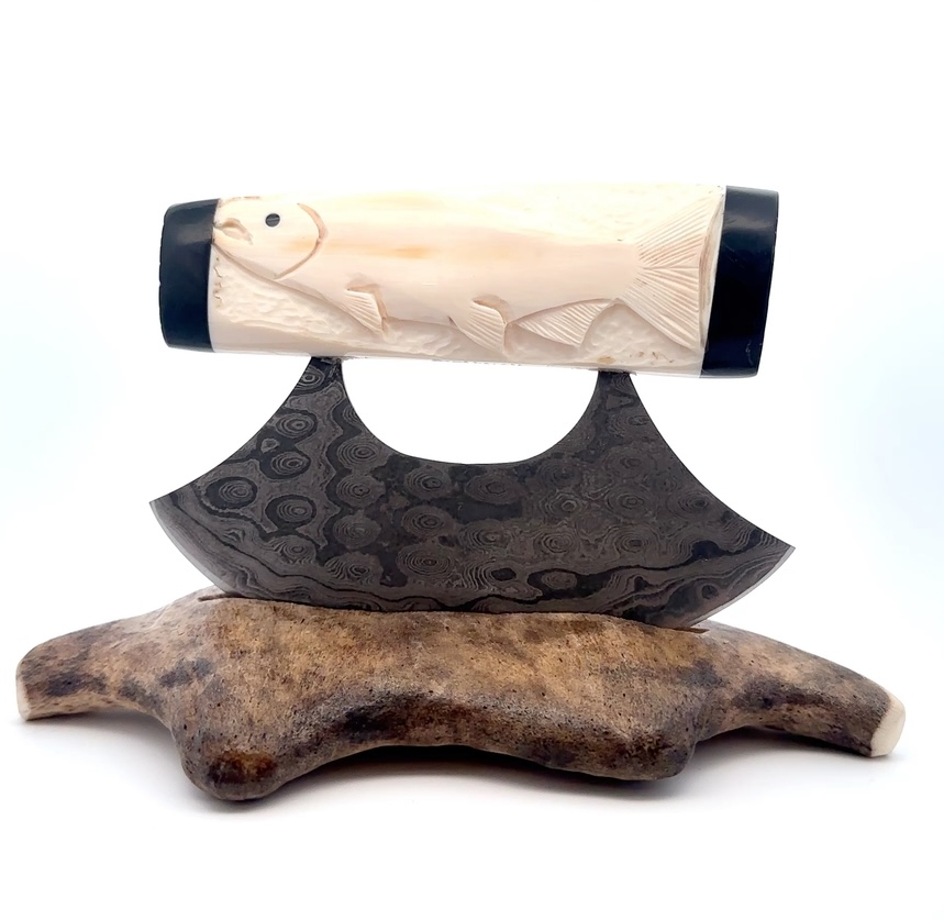 This walrus ivory and ebony wood Ulu is created here in Alaska. The base is made out of moose antler. Additionally, the blade is made out of layered Damascus steel. This piece is carved and signed by an Alaska native artist and features baleen highlights. Due to the material being natural, each knife and base set have a distinctive one of a kind look. This piece makes a great traditional knife for a collector. As well as a useful tool in the kitchen for vegetables and pizza.