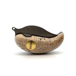 This walrus oosik handle Ulu shaped pocket knife is about 2 3/4″ long when folded and just over 4 1/2 when open. The handle consists of fossilized walrus oosik. This is a beautiful and very durable material found along the northwest coast of Alaska. Alaskan knife maker, Bob Merry, designed and made the knife here in Anchorage.