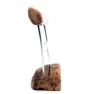 This whale bone Ulu is created here in Alaska. The handle and base are both made out of whale bone. Additionally, the blade is made out of stainless steel by the Alaska Knife Company. Due to the material being natural, each knife and base set have a distinctive one of a kind look. This piece makes a great traditional knife for a collector. As well as a useful tool in the kitchen for vegetables and pizza.