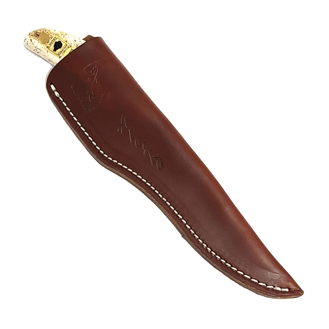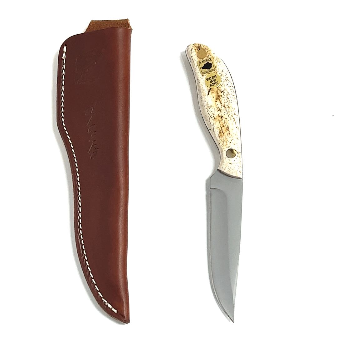 The 9″ walrus jaw handle hunting knife comes with a heavy duty leather sheath. The handle is made of walrus jawbone bone, this is a beautiful and very durable material found when beach combing in western Alaska. It is designed and made here in Anchorage by Alaskan knife maker, Bob Merry.
